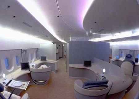 空中客车A380的机舱配备了为客机研发的最先进的机上娱乐系统,光纤配电网络使电影、视频游戏和电视节目的选择更加灵活完备。在飞机上乘客还 可以使用便携式计算机和打电话。有更多的开放空间,比如商务中心。底舱可选择为设置休息区、商务区、酒吧或其它的娱乐区,按照不同航空公司的需求,还可安 排其它设施,如理发店、卧铺、赌场、按摩室或儿童游戏场。宽大的空间可供头等舱内安排私人套间,甚至包括淋浴设施的浴室。