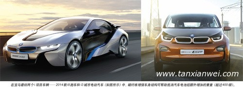 2014款宝马i3电动汽车将于今年晚些时候将投入生产,总的目标是将其重量减轻200kg(440lb),来抵消电池重量。2014款i8车型——插电式混合动力跑车也将获得相同的减重效果。一般来说,一辆车重量减轻100kg(220lb),二氧化碳排放量平均来看最高可降低10g/km。而这些车型(宝马所谓Project i子品牌的首批车型)在乘客防护方面的性能都将受益于碳纤维优越的弹性模量及其拉伸强度——这两个参数都超过硼钢。