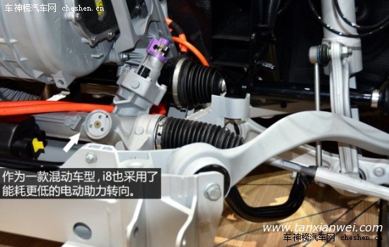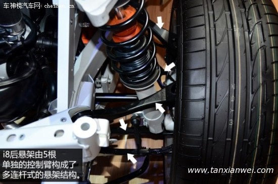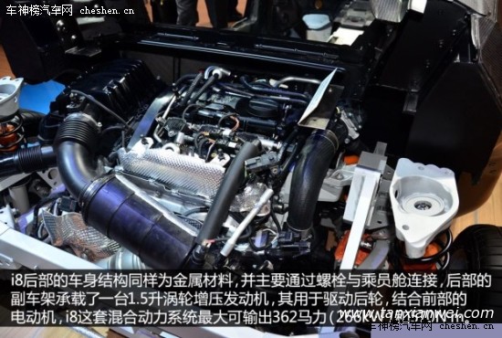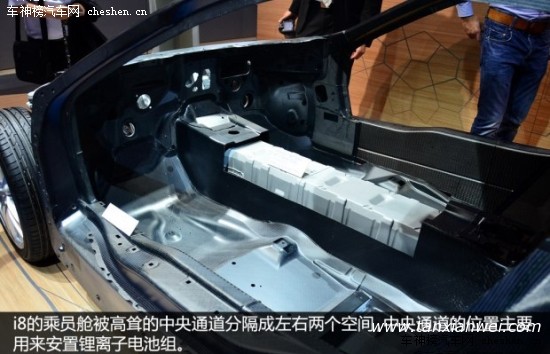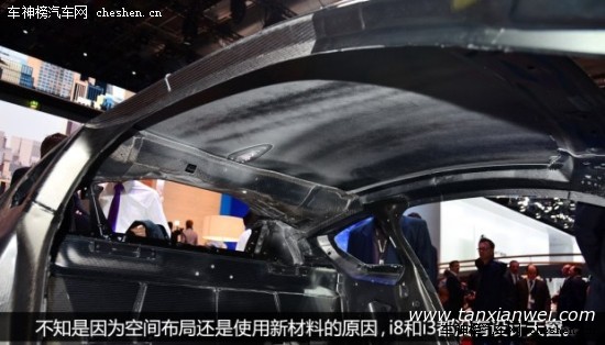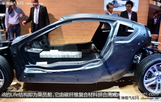 整个乘员舱的结构由多层碳纤维复合材料拼合而成,轻量化和高强度是它最大的特点,这样的设计类似于F1赛车中驾驶舱的单体横造结构(由碳纤维复合材料构成),而最终的效果就是i8的车身重量不到1.5吨。