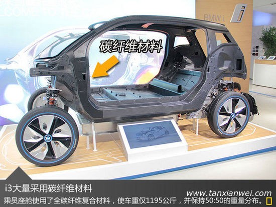 前不久宝马首款以碳纤维复合材料为车身材料的量产电动汽车——i3也已在华亮相。其中i3在乘务舱内大量运用了碳纤维元素,使得这款电动车的整备质量仅为1195公斤。i3碳纤维材料的使用成功的减轻了车身重量,从而平衡电池的重量,保持其前后50:50的重量分配比同时还帮助其增加了续航里程,并成为了全球最轻的电动车。