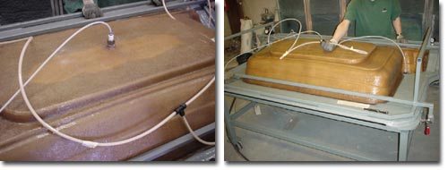 模具是这两种工艺的最大差别,在RTM投资中,由于注射压力大,相当部分的成本花在模具和夹紧装置上。这样对于产量少的产品在价格上是不适合的。RTM工艺模具使用寿命可达5000件以上,生产效率高,适合年产2000件以上的产品。